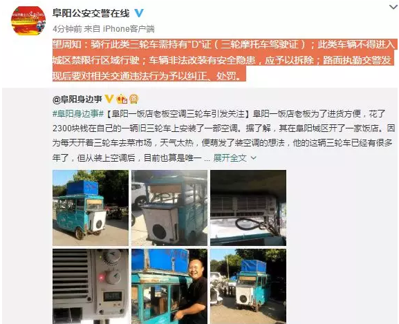 3年前,阜阳市民邢继涛为了进货方便,花了2300块钱在自己的一辆旧三轮车上安装了一部空调,成了当地唯一一辆装有空调的三轮车。