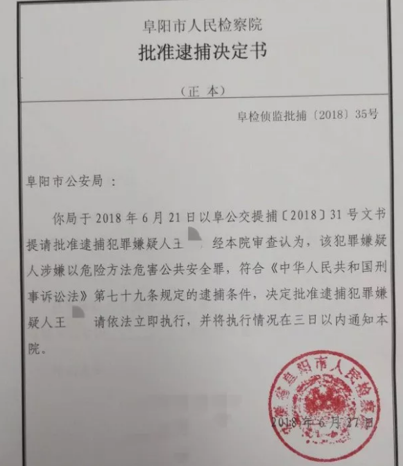 6月27日,阜阳市人民检察院决定对涉嫌以“危险方法危害公共安全罪”的犯罪嫌疑人王某批准逮捕。