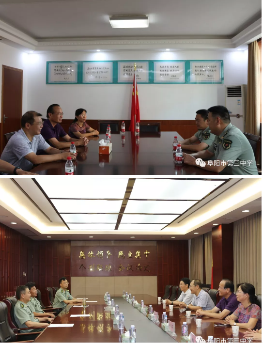 阜阳军分区政委李光,司令员白中华,副司令员龚辉和颍州区人民武装部政委丁峰,副部长江波等领导对阜阳三中的到来表示感谢,感谢阜阳三中对现役军人子女就学给予的帮助和关爱,为他们解除了后顾之忧;再次重申了阜阳军分区、人武部和阜阳三中的深厚情谊,今后会一如既往地支持阜阳三中的发展。
